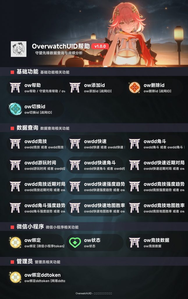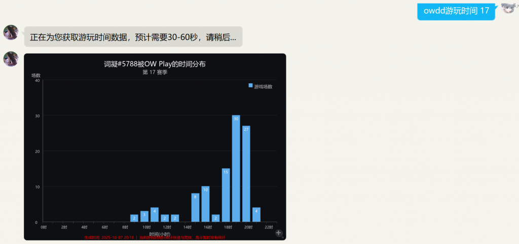 你可以发送owdd游玩时间查询整个赛季游玩OW的时间段,和其他指令一样支持战网ID查询以及往期赛季查询,例如:owdd游玩时间