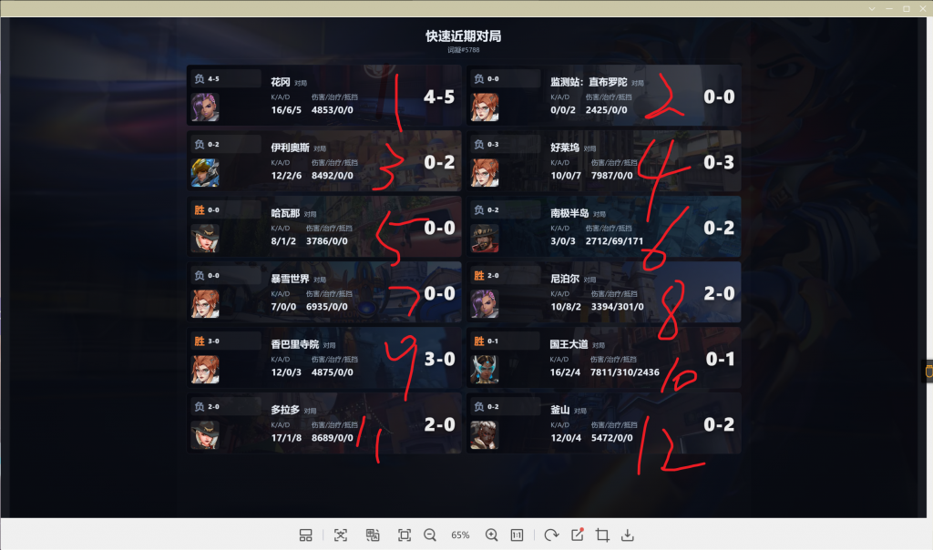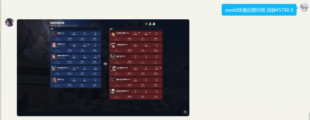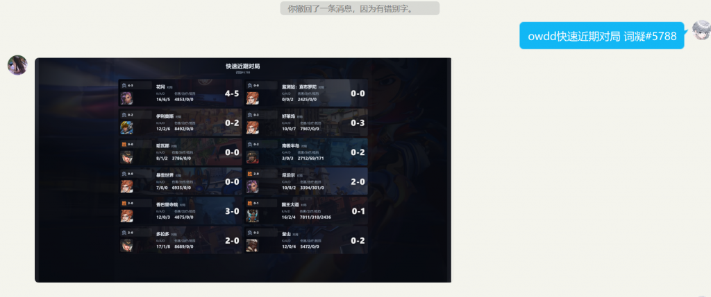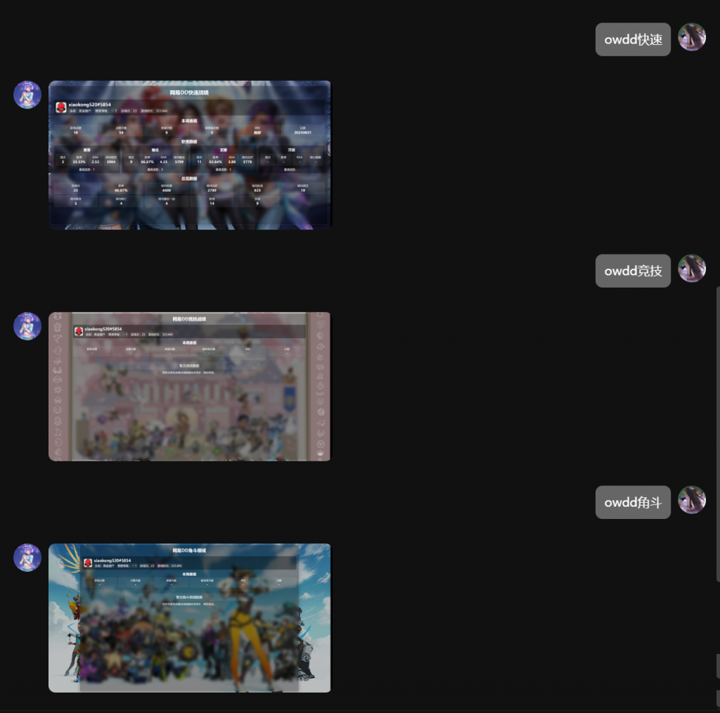 可以发送owdd快速近期对局,owdd竞技近期对局或者owdd快速近期对局 [战网id],owdd竞技近期对局 [战网id]查询近期快速/竞技对局的总览数据